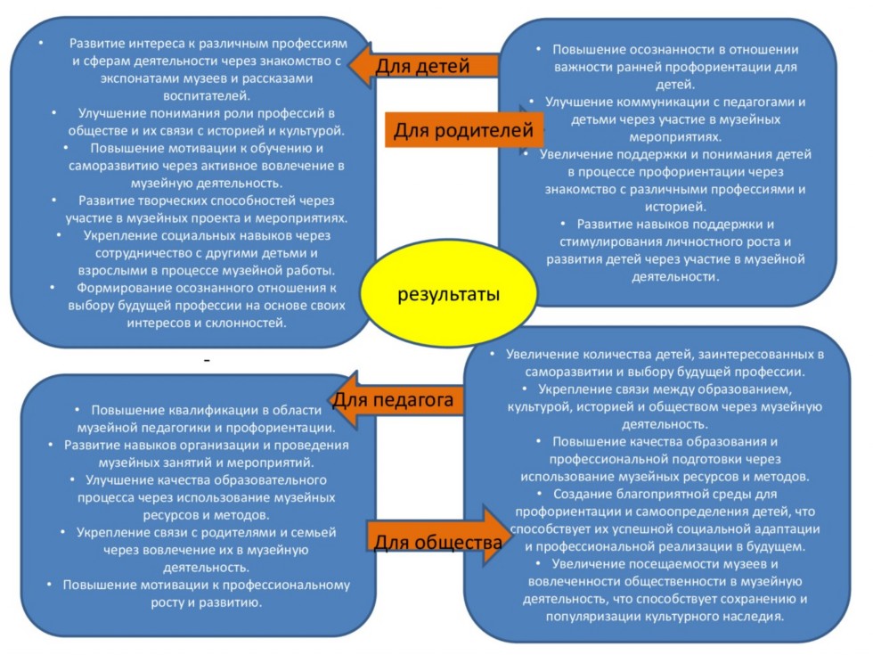 На этой странице я хочу поделиться с вами результатами нашей работы по развитию ранней профориентации посредством музейных экспозиций. Мы понимаем, что посещение музеев - это не только возможность познакомиться с историей и культурой, но и отличная возможность открыть для детей мир профессий. Наша работа по ранней профориентации посредством музейных экспозиций дает прекрасные результаты, и мы будем и дальше продолжать ее, чтобы помочь нашим детям открыть для себя мир профессий и найти свое призвание!" |